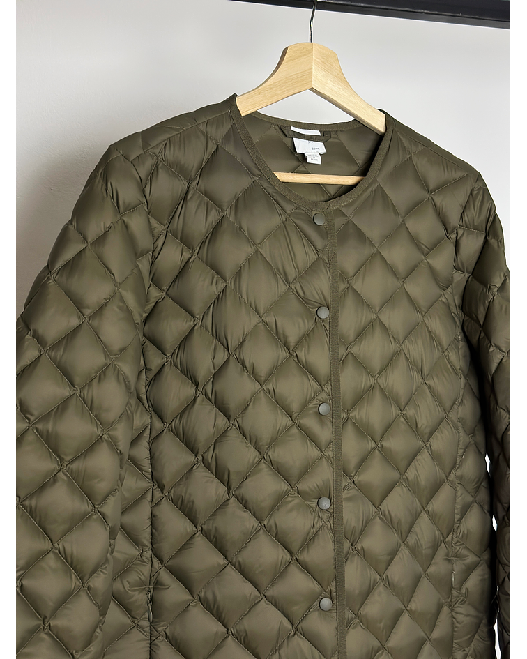chaqueta acolchada de plumas, color verde oliva.